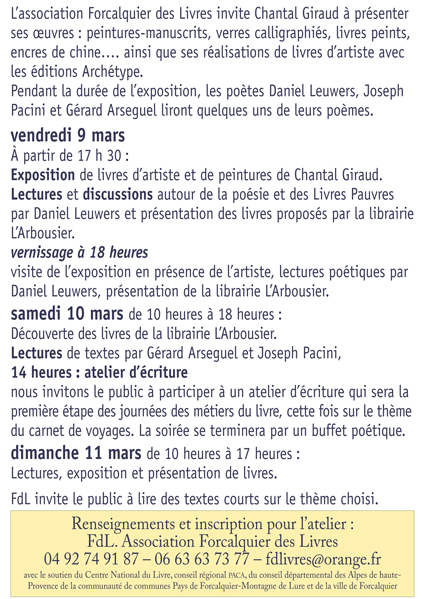 L'association Forcalquier des Livres invite Chantal Giraud - GIRAUD CAUCHY à présenter ses œuvres : peintures-manuscrites, verres calligraphiés, livres peints