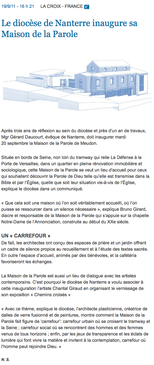 A travers l’exposition « chemins croisés », il nous est proposé un parcours au cœur du travail de Chantal Giraud. Ce travail de création, qui mêle la peinture aux traits épurés, cristallins et la sculpture de verres transformés par le feu, entre aujourd’hui en résonance avec ce nouveau lieu qu’est la maison de la Parole au centre de la cité de Meudon… Maison de la parole, du silence, du dialogue avec l’art contemporain, désirée par le diocèse, se souhaite comme un espace où peut s’entendre et s’accueillir les différents chemins qui continuent de dire la grandeur de l’homme aujourd’hui lorsque sa capacité créatrice est mise au service de sa dignité. Se réapproprier la symbolique de la croix pour y entendre la nécessité et la subtilité des croisements qui fondent nos vies, telle est la première invitation que lance l’exposition… La Parole invitante ici, est l’œuvre de verre et de lumières de Chantal Giraud. Peintures et verres, ombres et opacités croisées viennent éclairer la symbolique jardin intérieur. Jardin où perlent d’étranges gouttes d’eau et où croissent fleurs et rosaces marquées par le temps qui s’écoule. Croiser l’autre est source d’avancées, de déplacements, autant de traversées qui invitent à se connaître davantage ; Lorsque j’approche, je croise l’autre, je côtoie et apprivoise le mystère de mon propre être ; Cette étape de l’exposition se propose comme une pause méditative sur la capacité à habiter l’intériorité, à construire son unité et cultiver son jardin intérieur, à habiter le monde aussi, croisé par le souffle de vie qui me traverse… Dans ce « chemins croisés » en découvrant le puissant travail de Chantal Giraud sur le Linceul du tombeau vide au matin de Pâques, c’est la question de l’unicité de l’être qui surgit… Magnifique sculpture de trente trois éléments, cette pièce maîtresse du Linceul constitue une parole humble, courageuse, ouverte. Le linceul de Chantal Giraud est chemin de dialogue entre l’art contemporain et la foi au Dieu de Jésus christ, une invitation à la transfiguration intérieure. Dominique DESSOLIN, OMI |